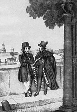 №1 - "Пушкин" нарисован сзади, по-видимому. созерцающим реку: это человек маленького роста, носящий высокую шляпу боливар (из-под которой густым темным потоком до плеч льются вниз волосы, завивающиеся на концах - он побрил свою голову летом 1819 г. в Михайловском, после тяжелой болезни, о которой чем меньше говорить, тем лучше, и носил коричневый кудрявый парик, пока его волосы не отрасли снова), суживающиеся панталоны по моде того времени и имеющий форму песочных часов длиннополый сюртук с двумя пуговицами на талии. Он слегка оперся своим левым локтем на парапет, ноги скрещены, левая нога беспечна вытянута.